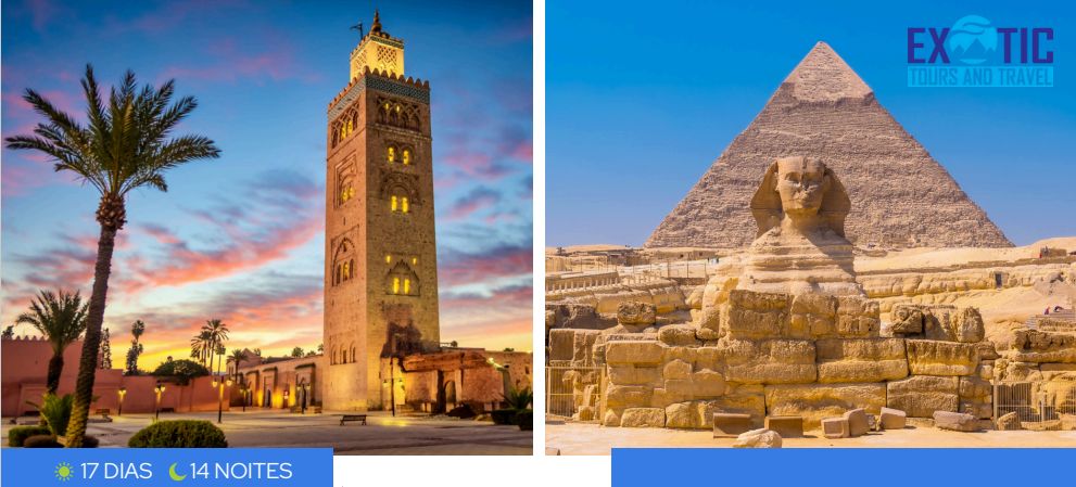 17 Dias/ 14 Noites. Pacote com aéreo saindo de São Paulo no dia 04 de dezembro. Itinerário: 01 Nt (Casablanca) - 02 Nts (Fez) - 01 Nt (Erfoud) - 1 Nt (Ouarzazate) - 01 Nt (Marrakech) - 03 Nts (Cairo) - 04 Nts (Cruzeiro pelo Rio Nilo) - Cairo (1 nt)