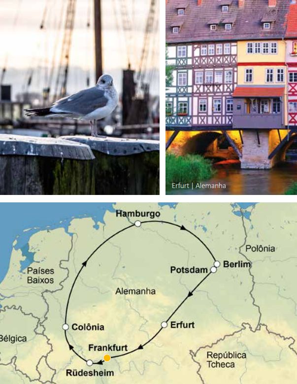 . Guia acompanhante bilíngue em espanhol e português do 2° ao 7 dia (motorista-guia para grupos com menos de 8 pessoas). 7 dias de viagem passando por Frankfurt, Rüdesheim, St. Goar, Colônia, Hamburgo, Berlim, Frankfurt (sem hospedagem)